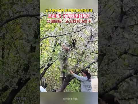 但一些人的不文明行為也對樹木造成損害。上海一女子在觀賞櫻花時,