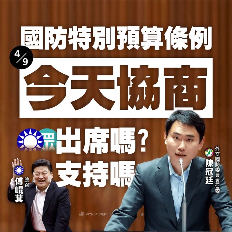 國防特別預算條例9日下午將協商,民進黨質疑國民黨是否會出席、支持(圖/翻攝自民