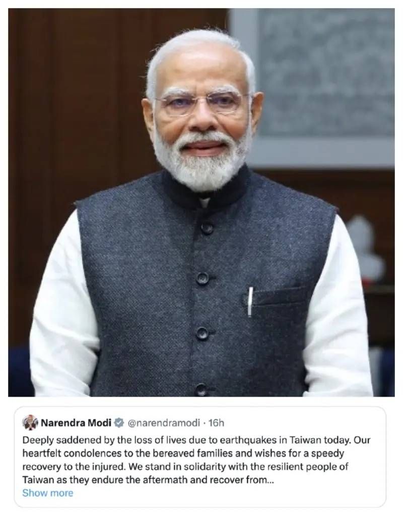 2024年4月3日,台灣花東發生規模芮氏7.1強震,造成20死、1155人傷。印度總理莫迪(