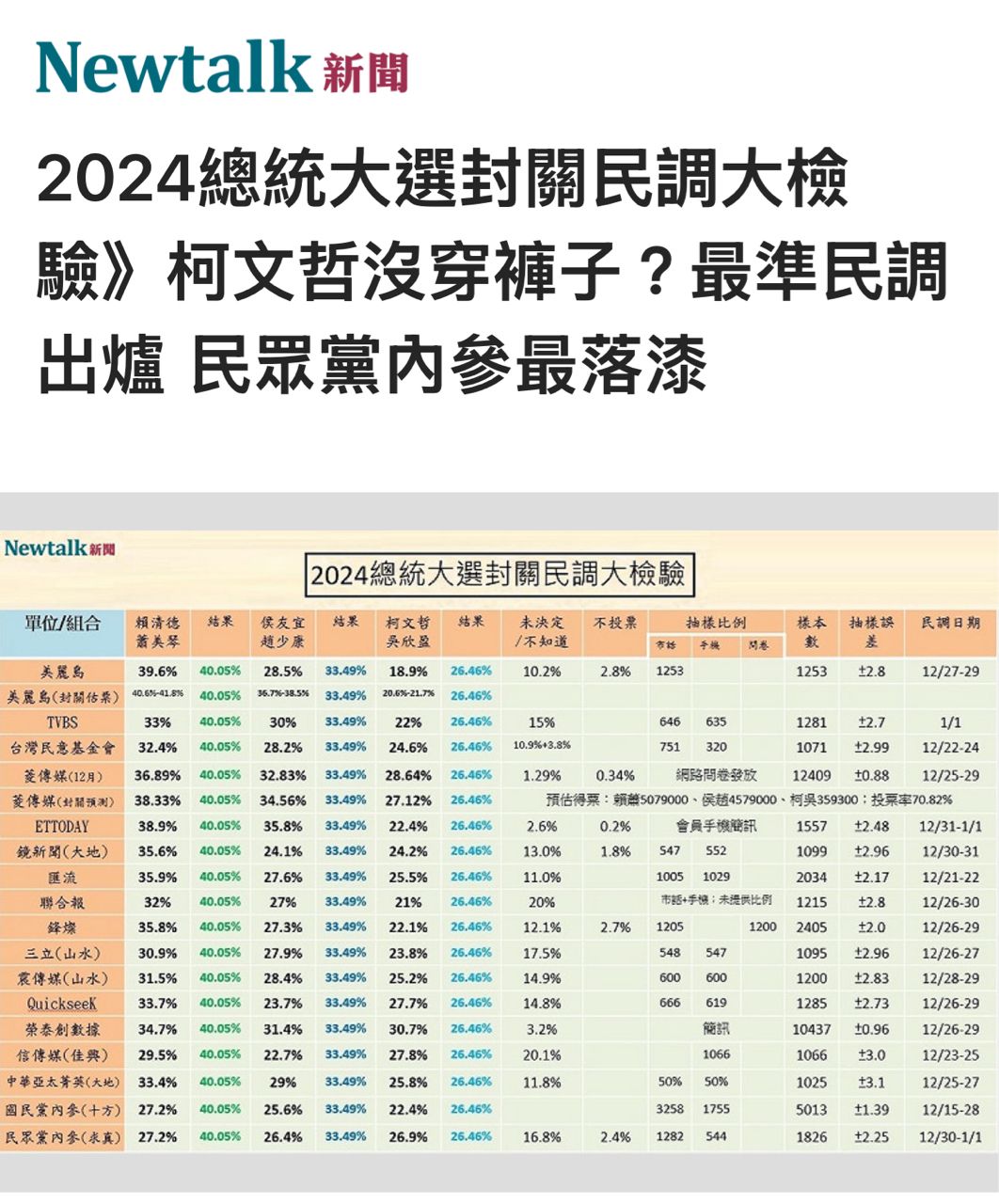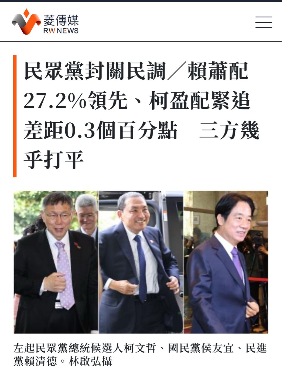 賴蕭配27.2%領先、柯盈配緊追差距0.3個百分點