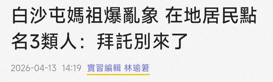 作者 k44754 (神仙索就此失傳了)標題 [新聞] 白沙屯媽祖爆亂象 在地居民點名3類人:時間 Mon Apr 13 23:26:28 2026
