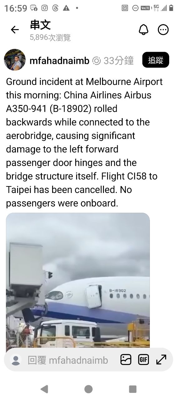 作者 gigaman (pipi)標題 [問卦] 墨爾本機場華航跟空橋相撞門好像扯壞了時間 Tue Apr 14 17:06:07 2026