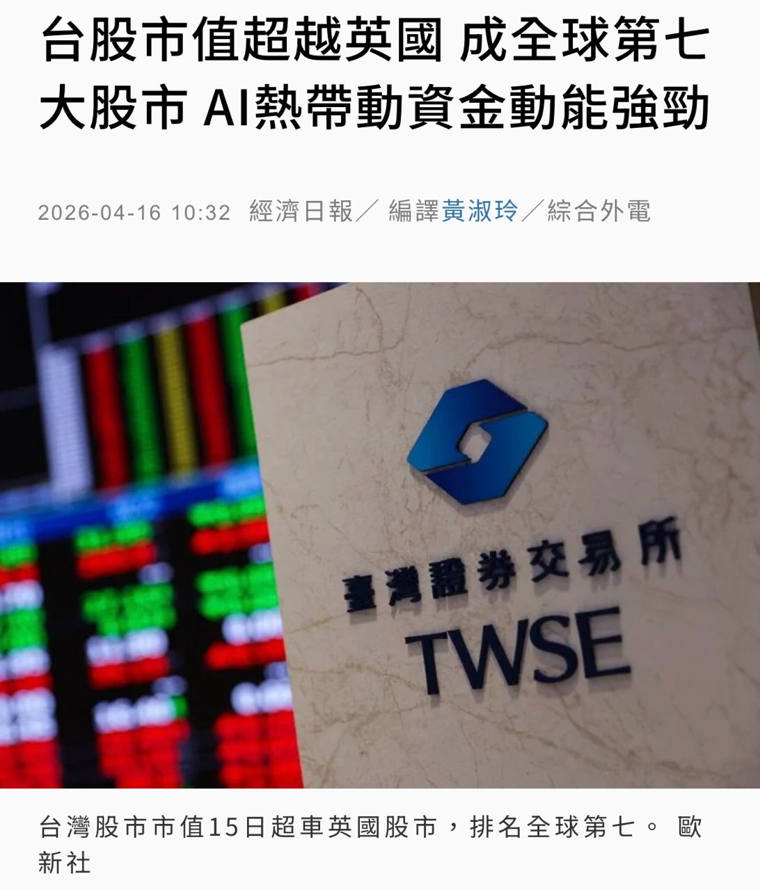 台股市值超越英國
