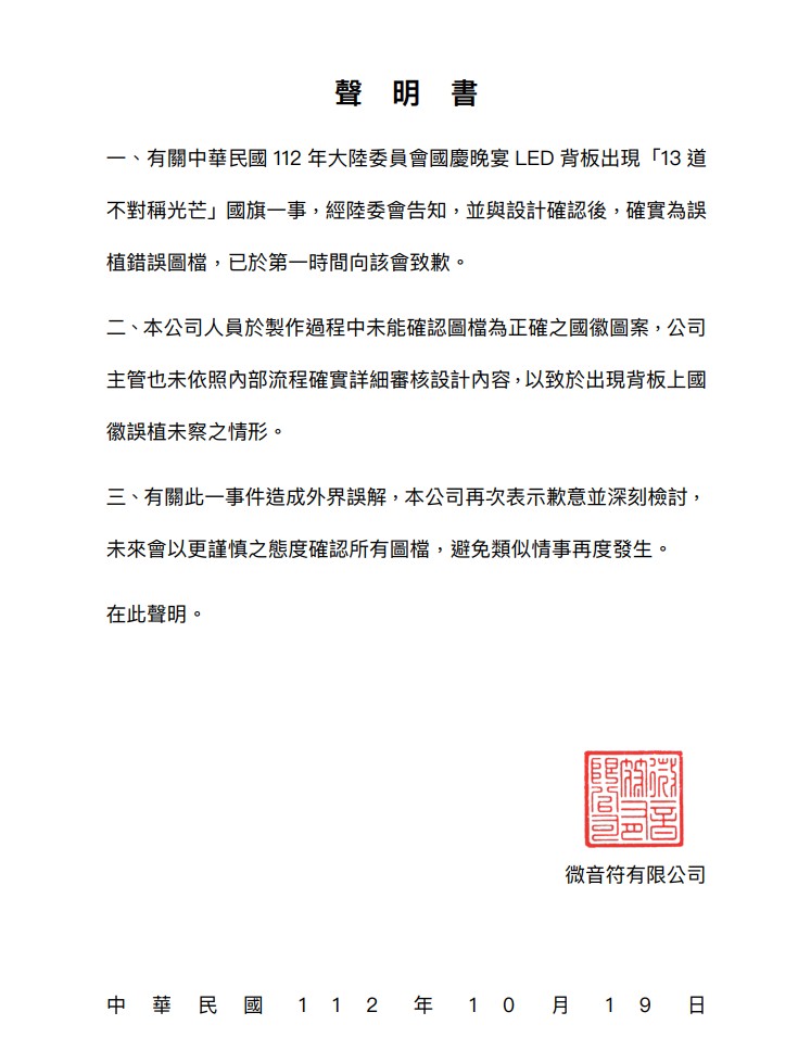 間向陸委會致歉。「微音符」表示,製作人員在製作過程中未能確認圖檔為正確之國徽圖
