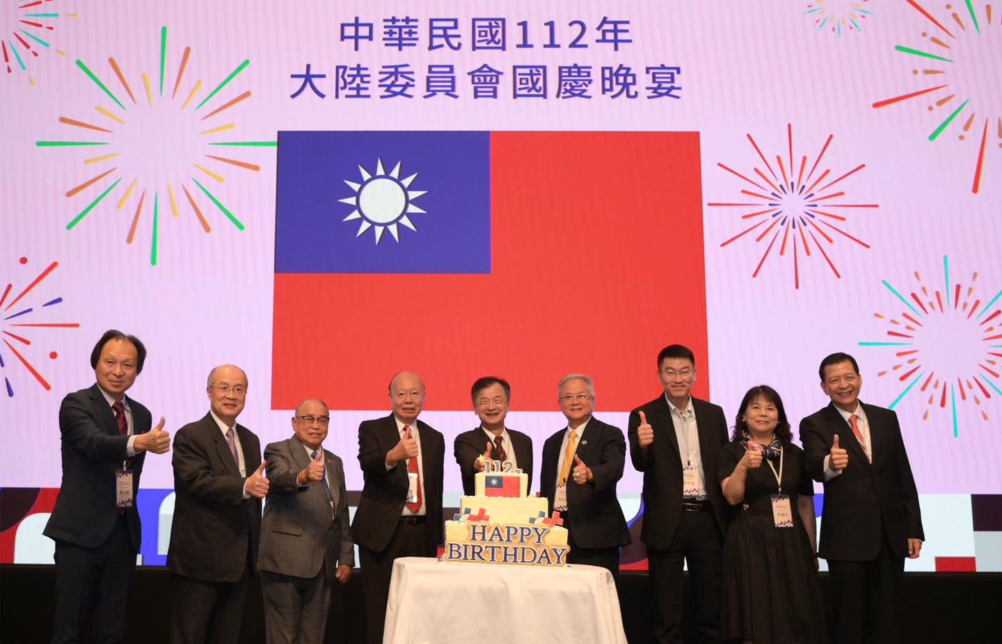 三和與會貴賓一同在舞台上,與生日蛋糕以及巨幅國旗合影。