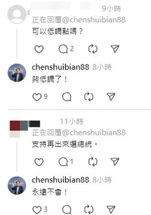 死忠扁迷留言,「支持再出來選總統」,陳水扁表示,「永遠不會!」