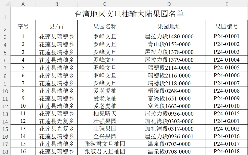 登記,此批有來自花蓮瑞穗鄉、光復鄉、玉里鎮、卓溪鄉的16家文旦果園獲准輸陸;「註