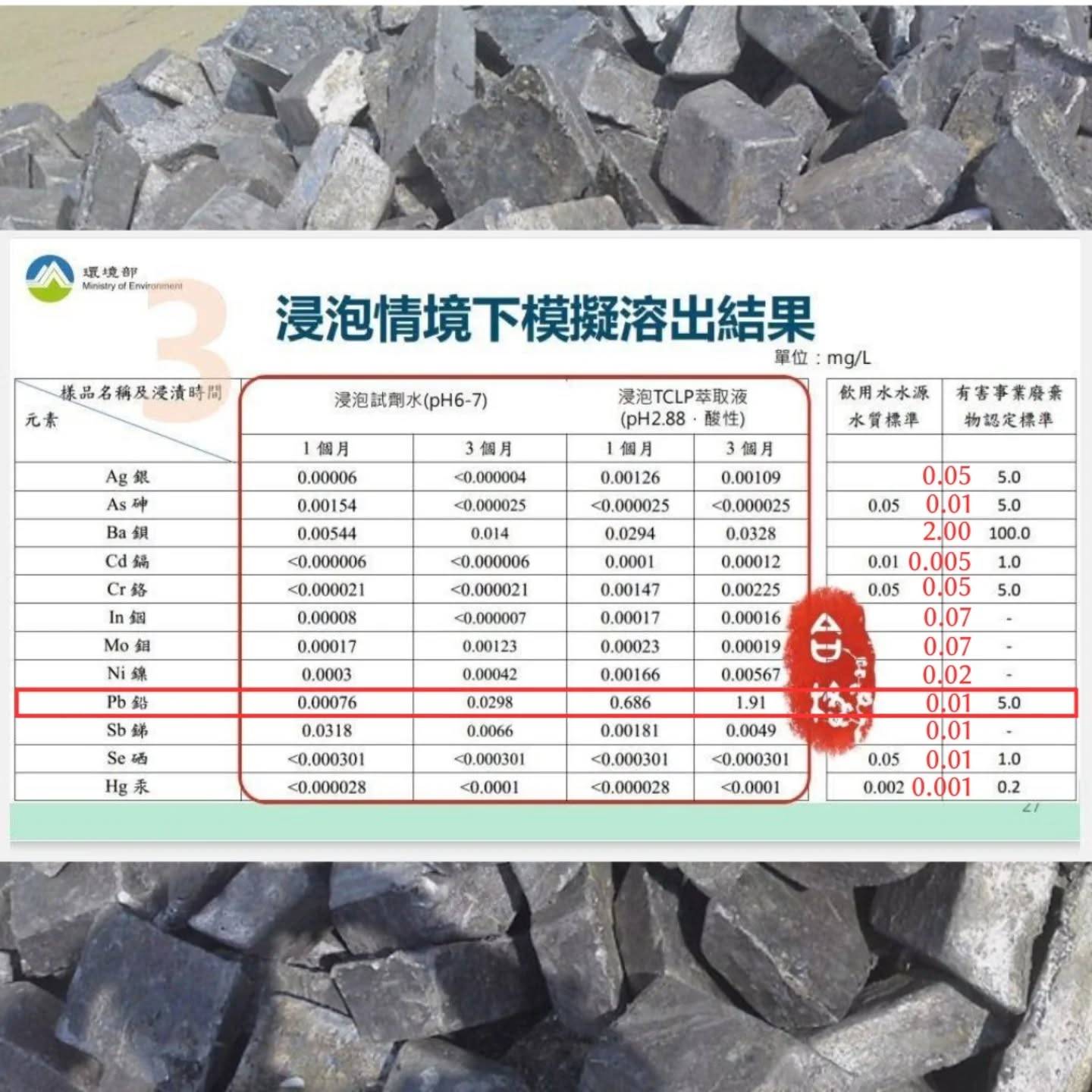 是未達有害廢棄物標準,而且試劑水浸泡 3 個月就超過飲用水標準,顯然鉛含量在一般