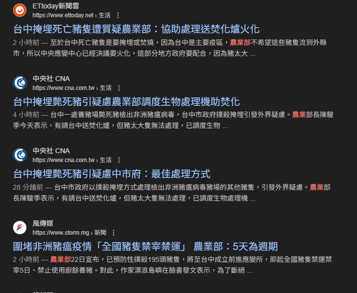 ※「新聞」標題須為原新聞標題且從頭張貼 ※ 1.新聞網址︰ 2.新聞來源︰ 中時 3.完整新聞標題: 台中近半豬場廚餘餵養未成立「廚餘蒸煮中心」遭抨擊 4.完整新聞內容︰ 台中爆發非洲豬瘟,台中市議 …