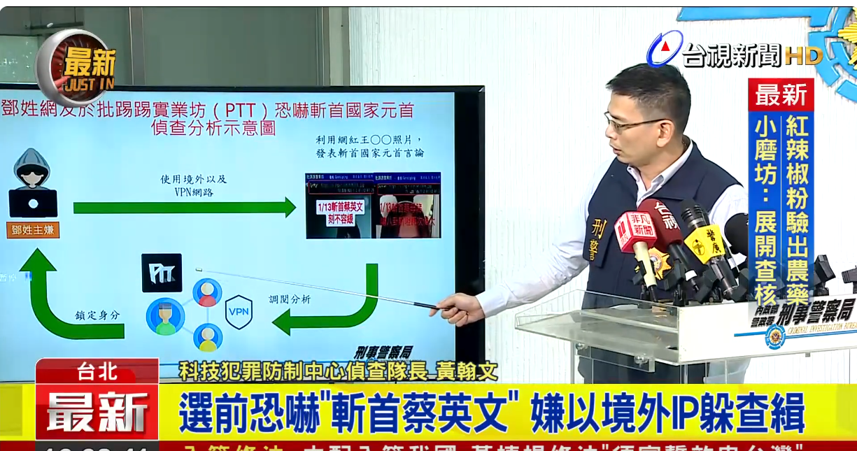 踢實業坊(PTT)八卦版留言「0113斬首蔡英文刻不容緩」等圖文,恐嚇言論造成社會紛
