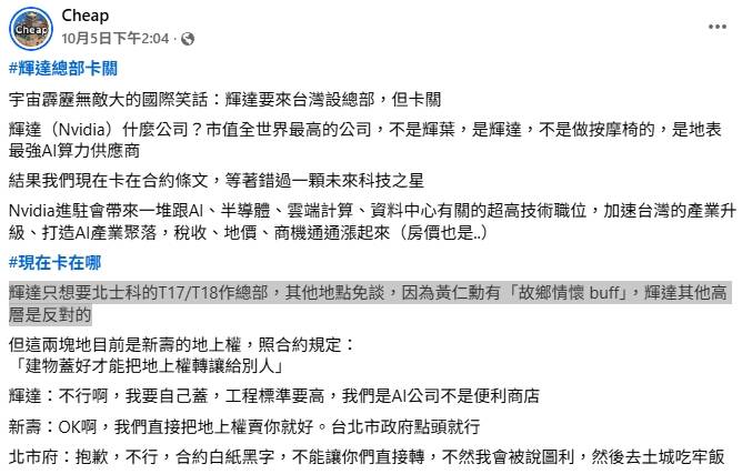 作者 win8719 (win8719)標題 [轉錄] Cheap -輝達離開台北機率不大時間 Sat Oct 11 12:30:22 2025