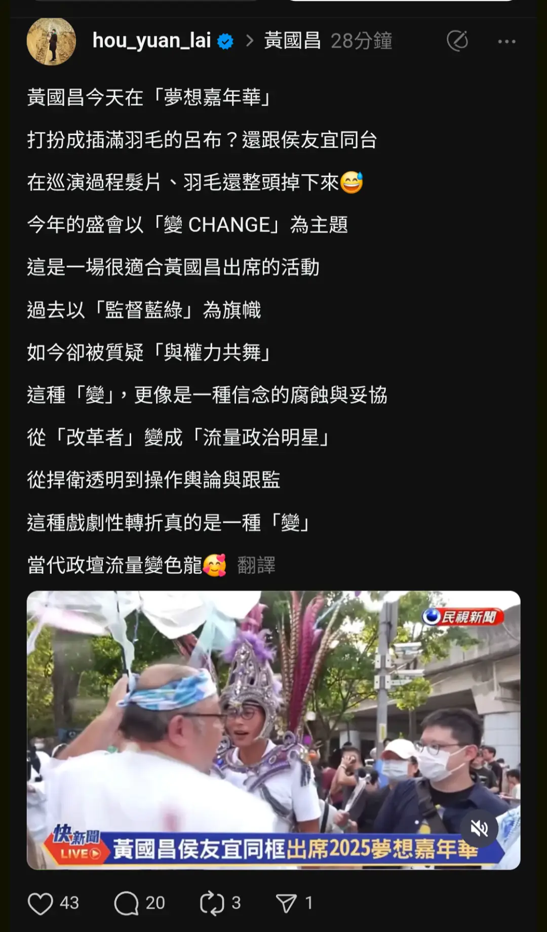 [討論] 網友:今天黃國昌參加活動的裝扮很像呂布 - HatePolitics 板