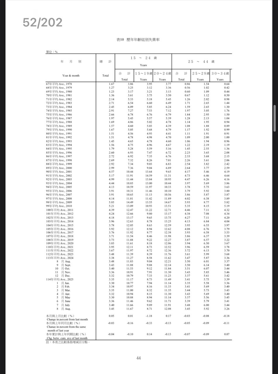 25至44歲族群則較為穩定,約3%至5%之間。近年(2024年)總體失業率約3.4%,15至24歲