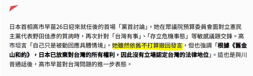 : 日本共同社報導,日本首相高市早苗26日在黨首討論上就台灣表示:「維持著非政府間的實務關係。(日本)根據《舊金山和約》放棄了全部許可權,並無認定台灣法律地位的立場。」