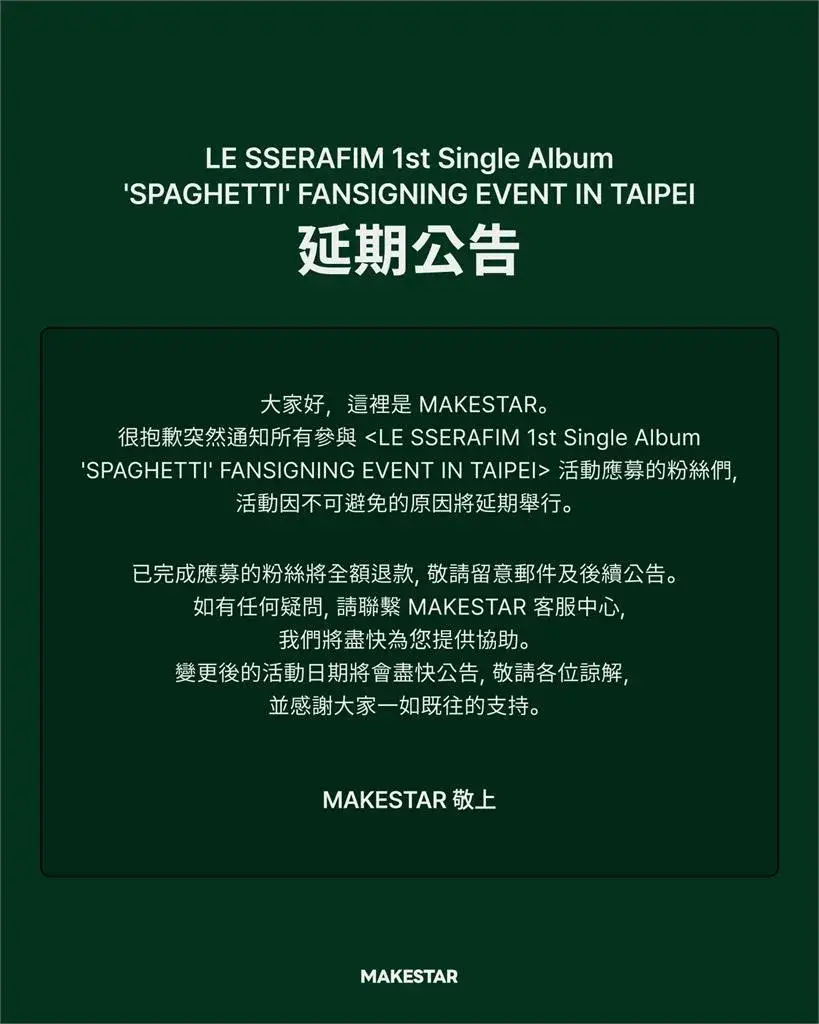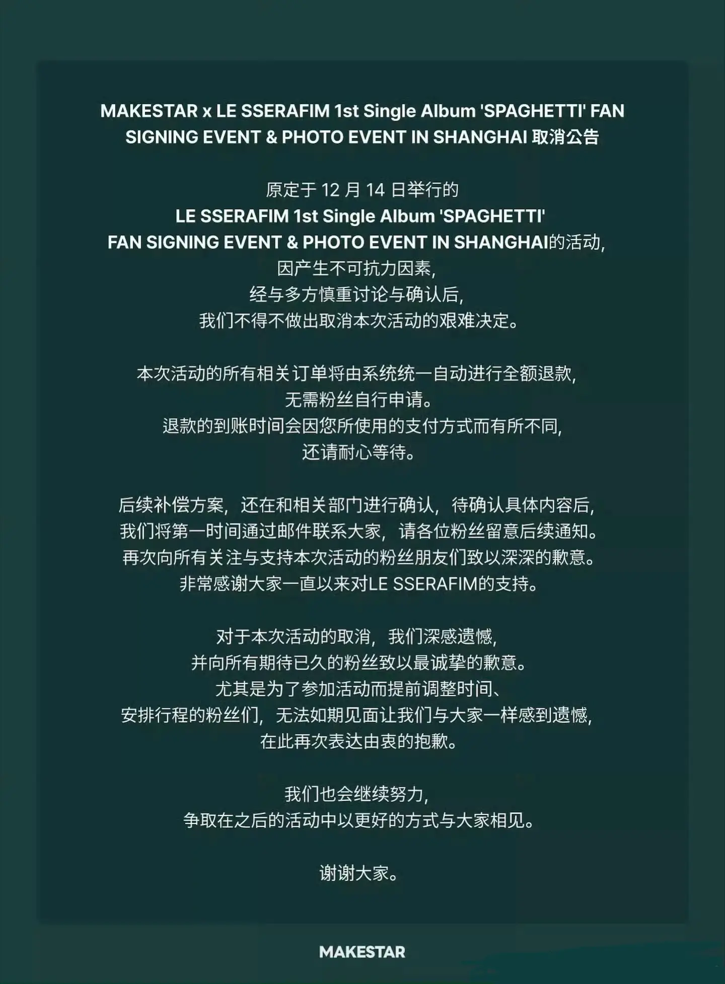 作者 Berotec (咦)標題 [討論] LE SSERAFIM上海簽售因不可抗力取消時間 Sat Dec 13 11:44:38 2025