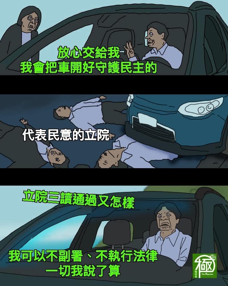 → sd09090: 昨天陳明鳳在政論說不副署是針對總統公告法案的制衡,源頭還是在總統不公告法案,後面就不會延生副署問題?