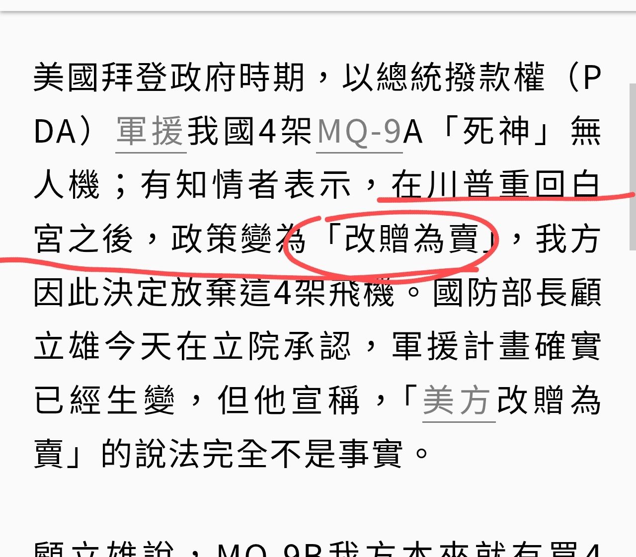 原本美國政府要無償贈與的4架無人機,改成要求我方用買的