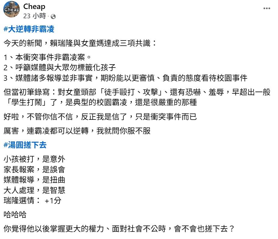 [討論] Cheap:厲害 賴瑞隆連霸凌都可以逆轉!!