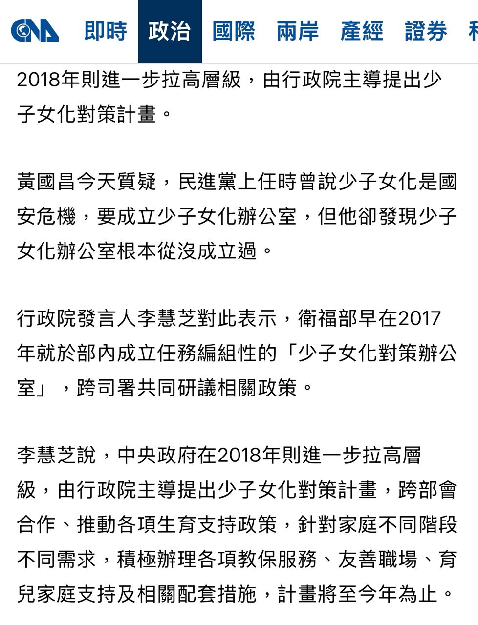 [新聞] 黃國昌指政院稱衛福部2017成立少子女化辦公室 石崇良:沒有成立