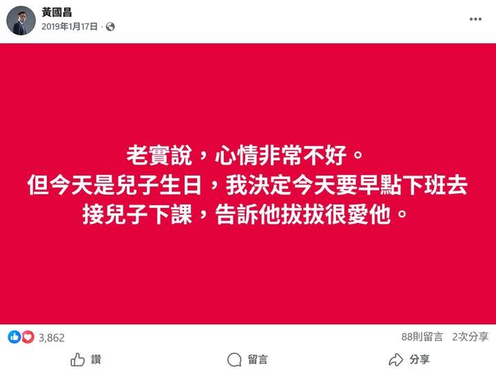2019年1月17日黃國昌臉書說,今天是他兒子的生日!