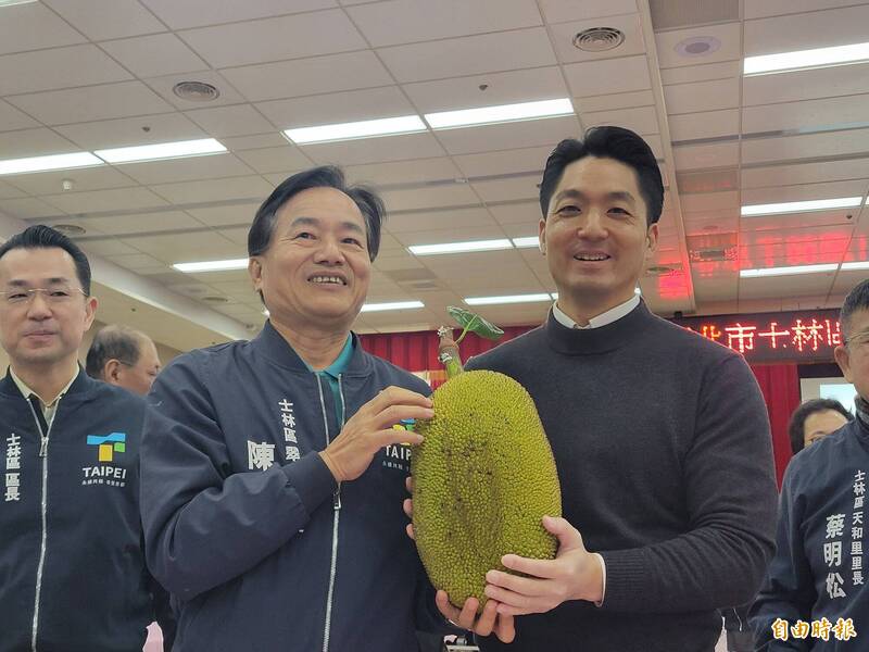 台北市長蔣萬安出席士林區「市長與里長有約」座談,翠山里長陳之貴(左)帶來自家種
