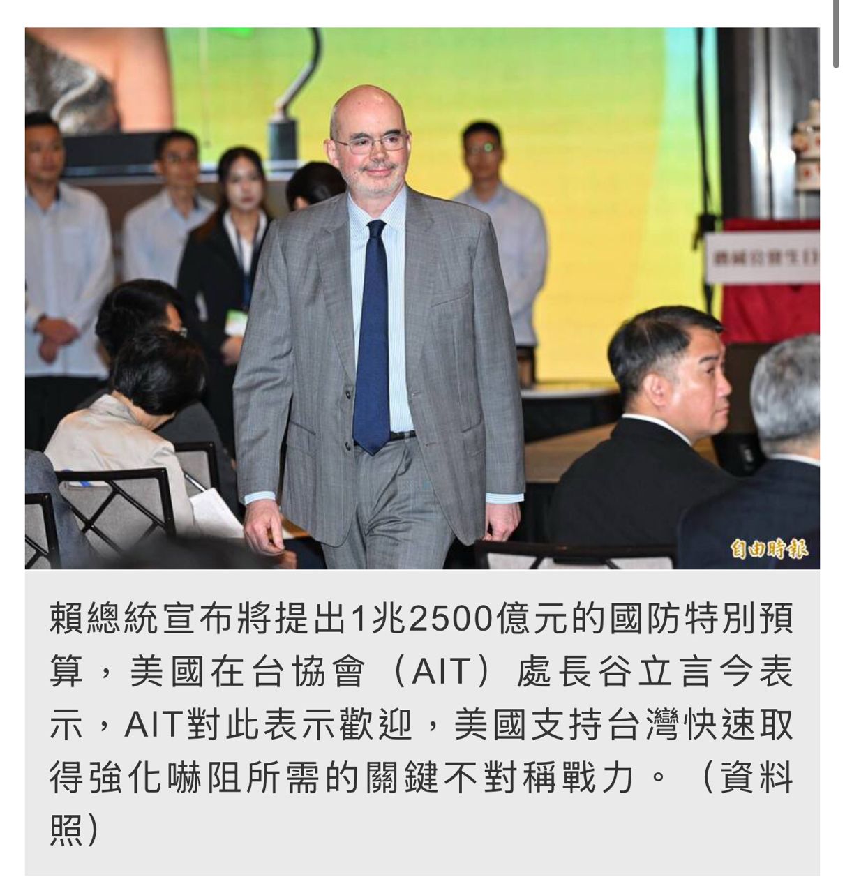 谷立言透過AIT臉書表示,賴清德總統宣布新台幣1兆2500億元的國防特別預算,美國在台