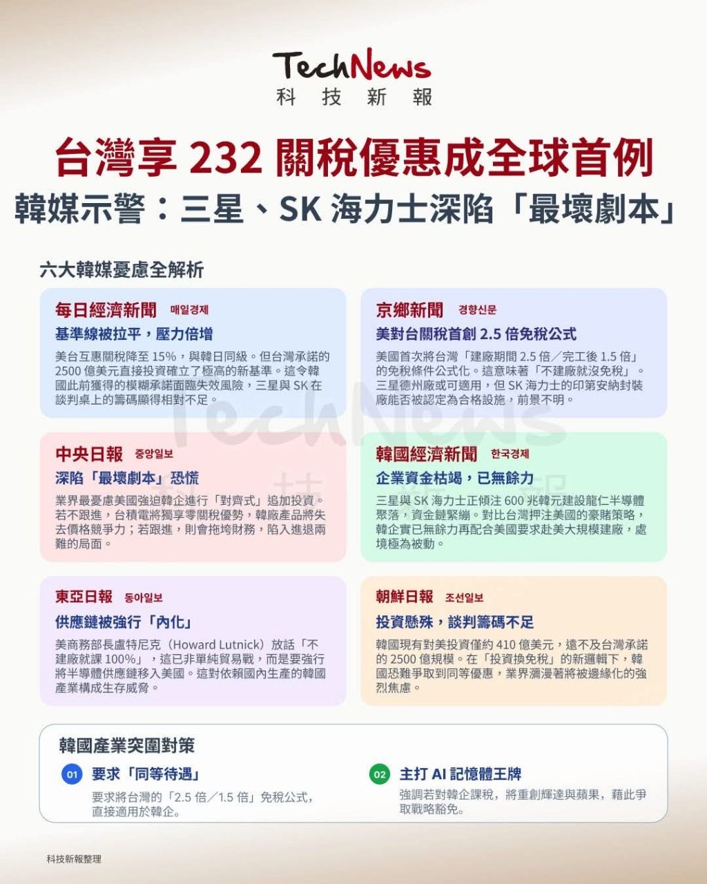 然而韓國業界有人擔憂,美方恐在後續談判中以「韓國投資規模不及台灣」為由,強行改