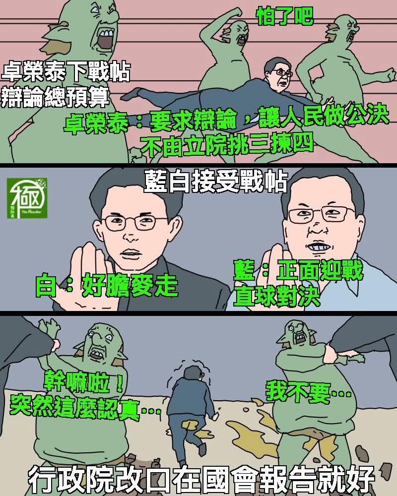 下午叫囂要求直接辯論的卓榮泰,在我立即坦率接戰後,不到兩小時,馬上態度急轉彎,