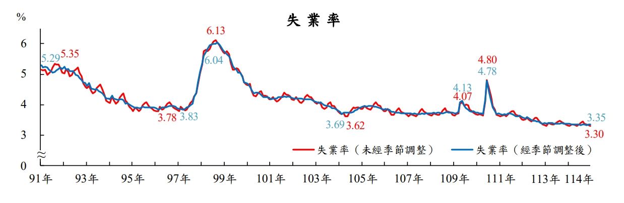 台灣失業率降3.35%新低