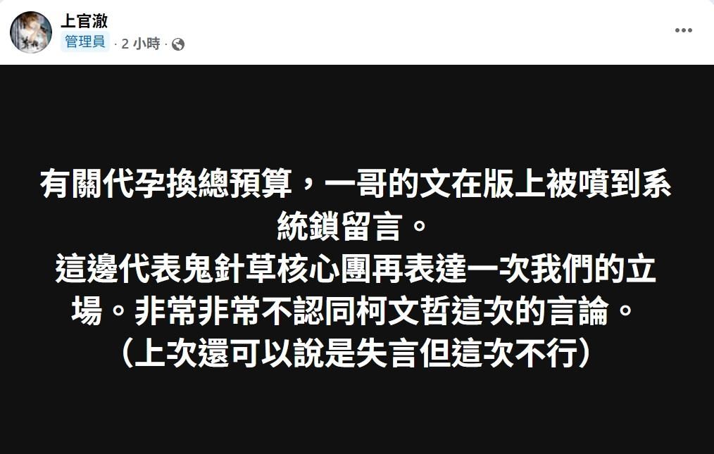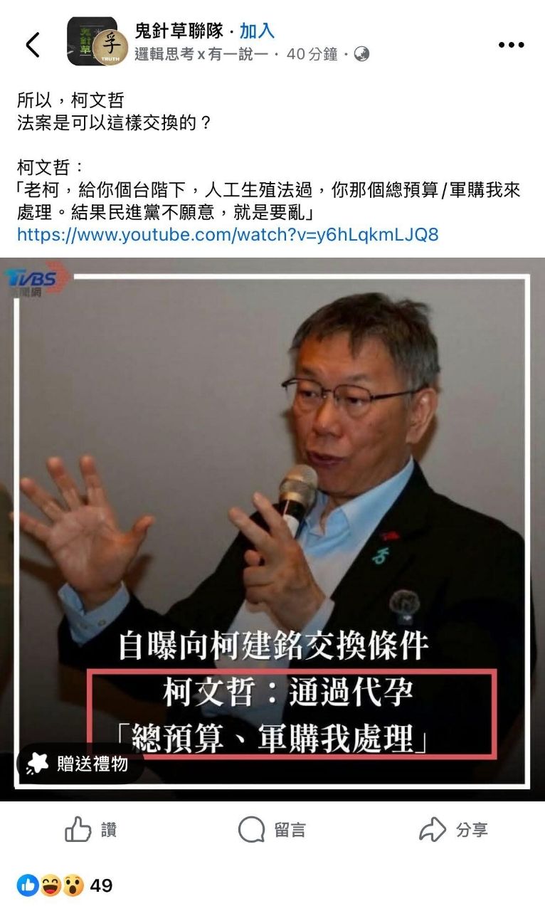 近日不斷發聲表示不認同柯文哲拿代孕法案交換國防預算的作為