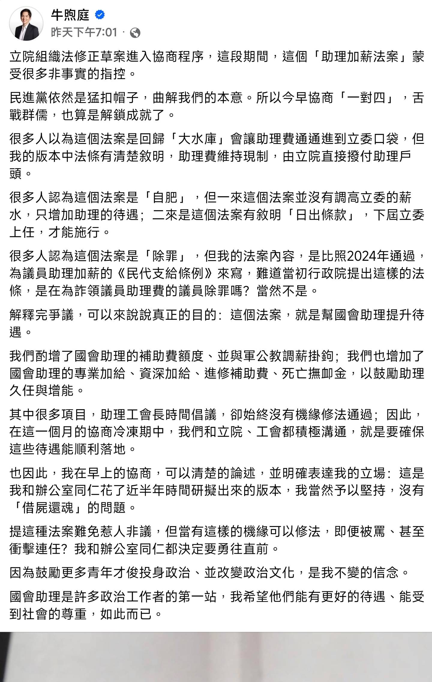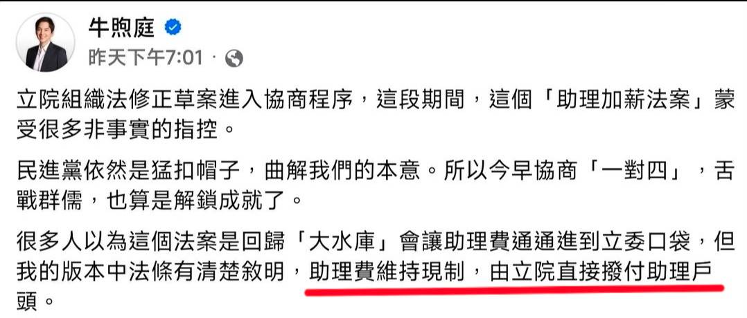 噓 colorhand: 牛煦庭說他沒有要幫助理費除罪化,我只能說看一個人不能只看他講什麼話,要看他做什麼事,牛煦庭版本將助理費改成立委補助費用,意思就是將來這些錢就算沒有給助理也是合法的。至於由立院直接撥付助理戶頭,啊錢是存進去就領不出來嗎?沒聽過薪水回捐做公積金?32F 118.150.190.109 台灣 01/30 23:17