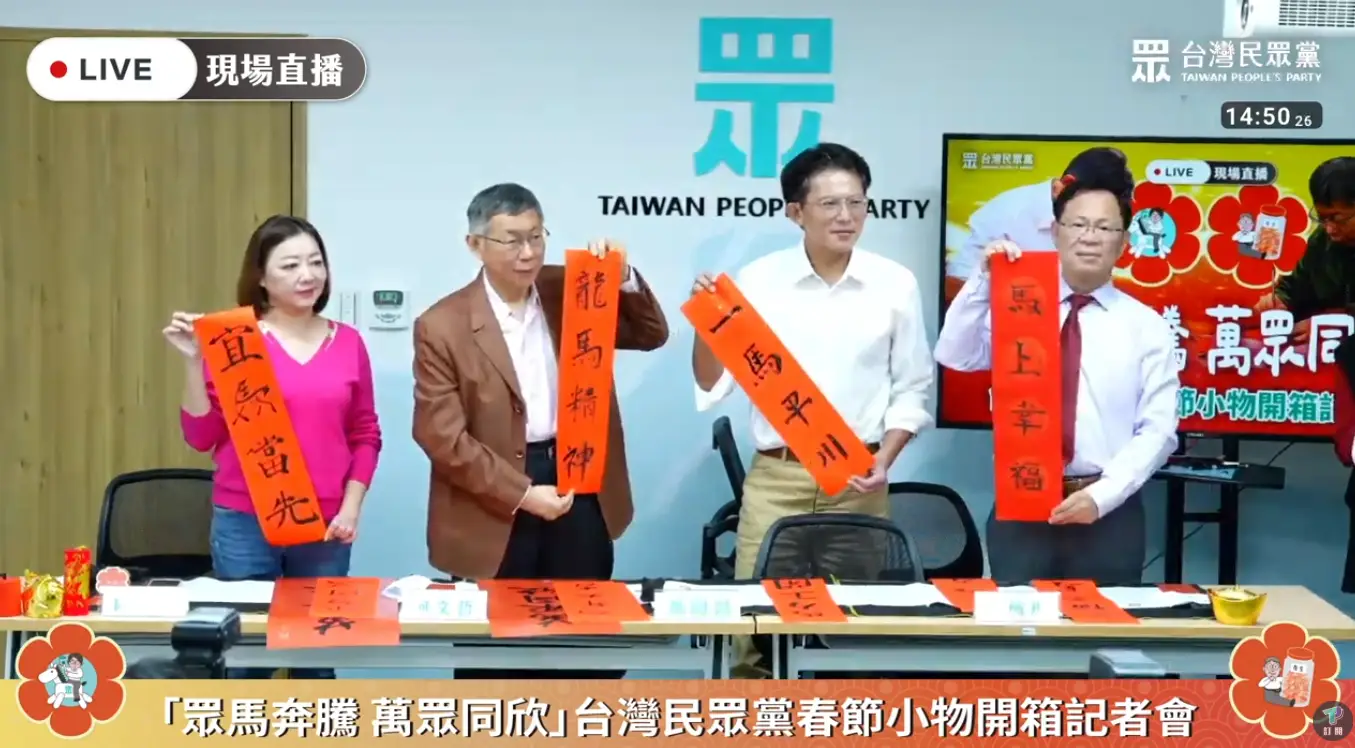 柯文哲、黃國昌等人,開箱春聯小物。