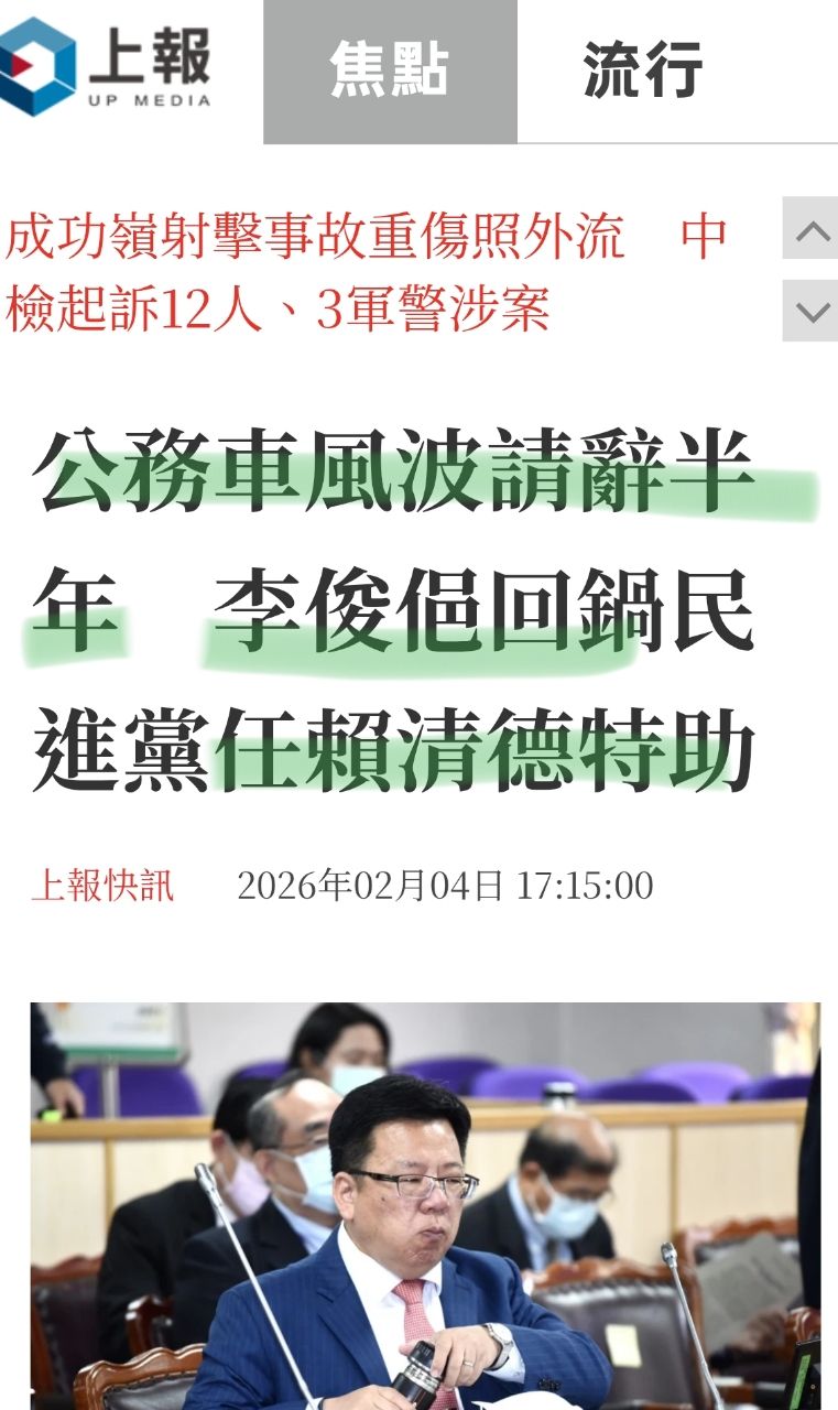 作者 kaminari22tw (拳擊袋鼠能暴漲數十倍的)標題 [新聞] 公務車風波請辭半年 李俊俋回鍋民進黨時間 Fri Feb 6 16:00:23 2026