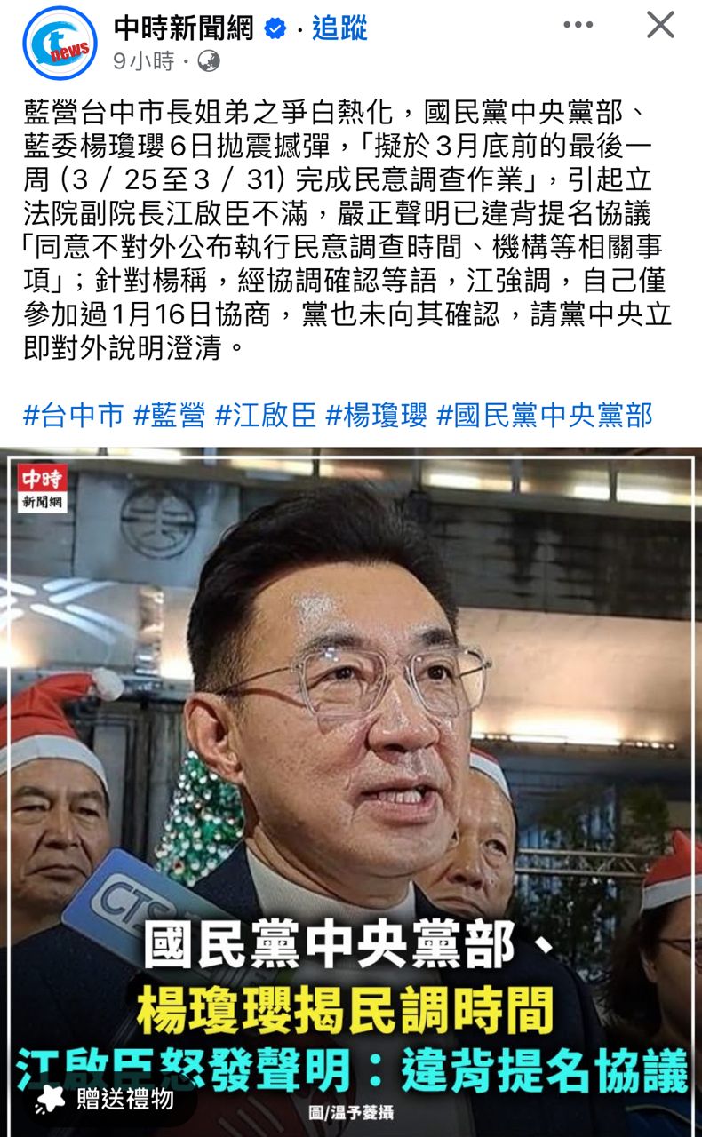 藍營台中市長姐弟之爭白熱化,國民黨中央黨部、藍委楊瓊瓔6日拋震撼彈,「擬於3月底