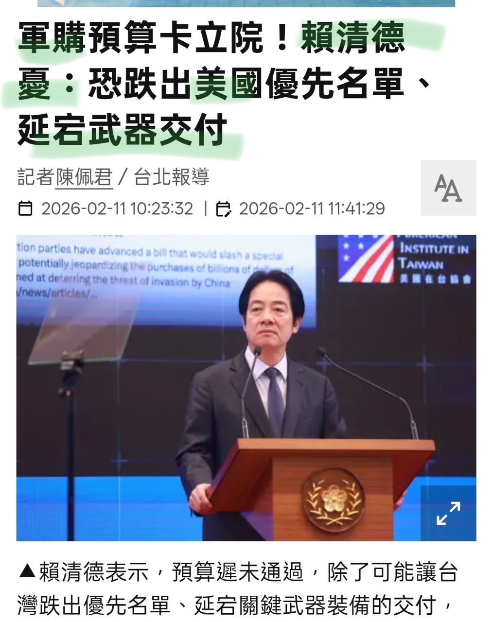 作者 kaminari22tw (拳擊袋鼠能暴漲數十倍的)標題 [討論] 賴清德:「擔心美國會延宕交付軍購」時間 Wed Feb 11 14:22:45 2026