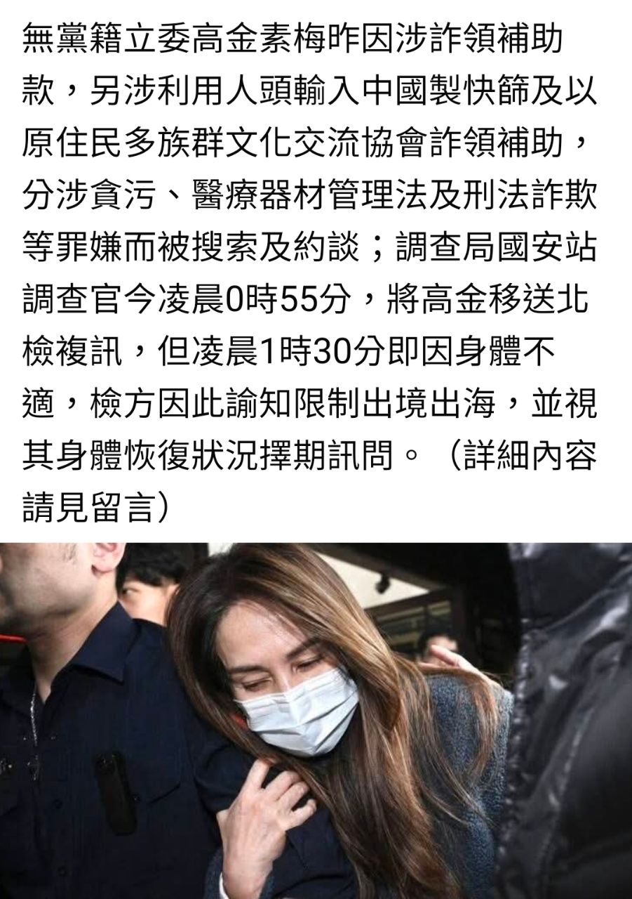 檢調今天(2/10)早上,前往立委高金素梅位在陽明山千萬豪宅搜索。消息曝光後,她的財