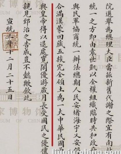 1912年2月12日,清朝隆裕太后以宣統皇帝溥儀名義頒布退位詔書,正式結束清朝統治