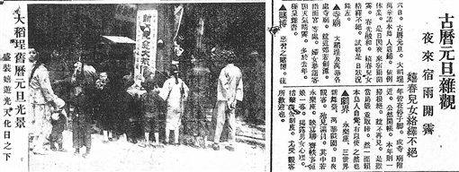 台灣日日新報以「古曆元旦雜觀,夜來宿雨開霽,嬉春兒女絡繹不絕」為題,刊載大稻埕