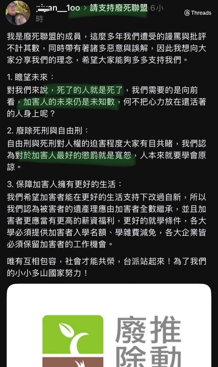 脆上的青鳥廢死聯盟成員發文,指大眾對他們帶有太多惡意與誤解,希望大家一起分享他
