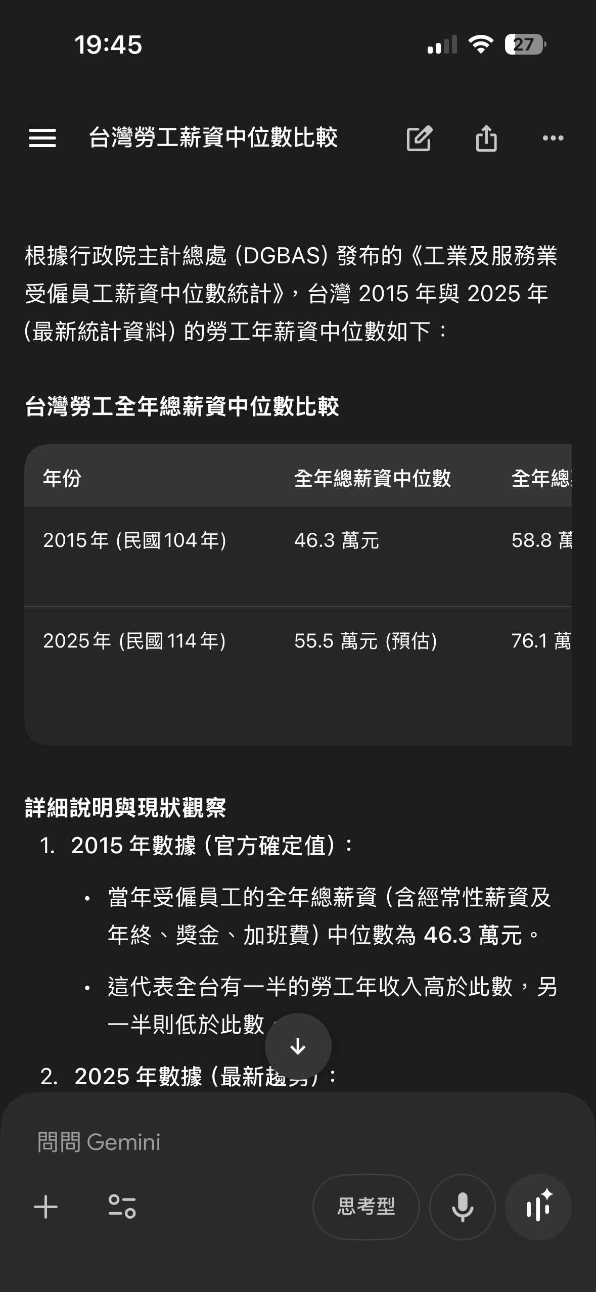Gemini說 2015薪資中位數大約 46.3萬 2025薪資中位數預估是55.5萬 漲幅大約20%