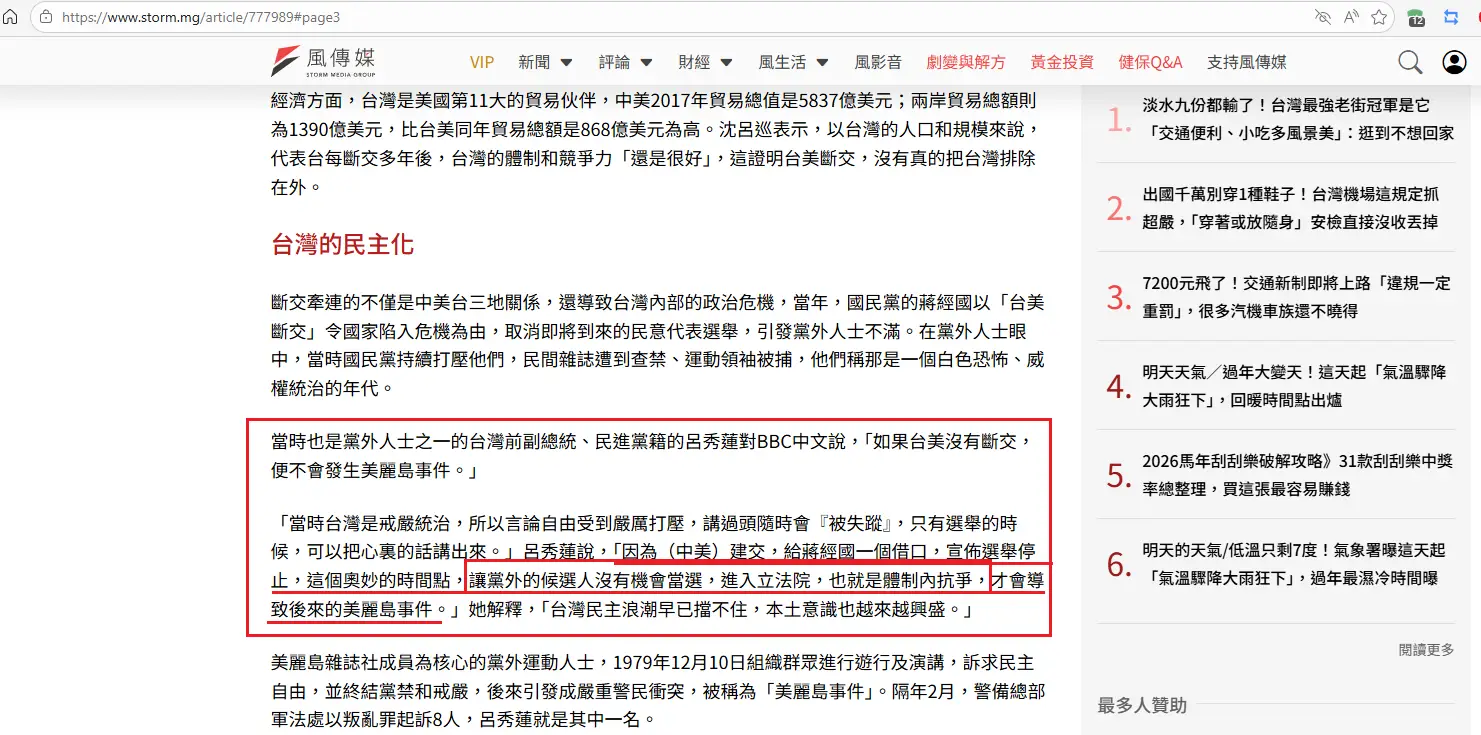 「因為(中美)建交,給蔣經國一個借口,宣佈選舉停止,這個奧妙的時間點,