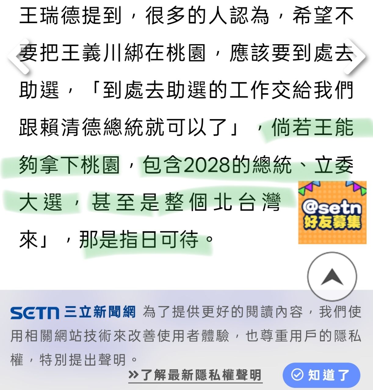 三立名嘴在節目上表示:若王義川拿下桃園 民進黨包含2028的總統、立委大選,甚至是