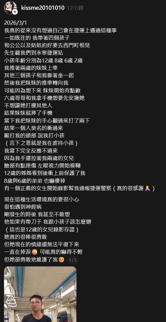 在捷運上憤怒狂揍帶著小孩的婦女