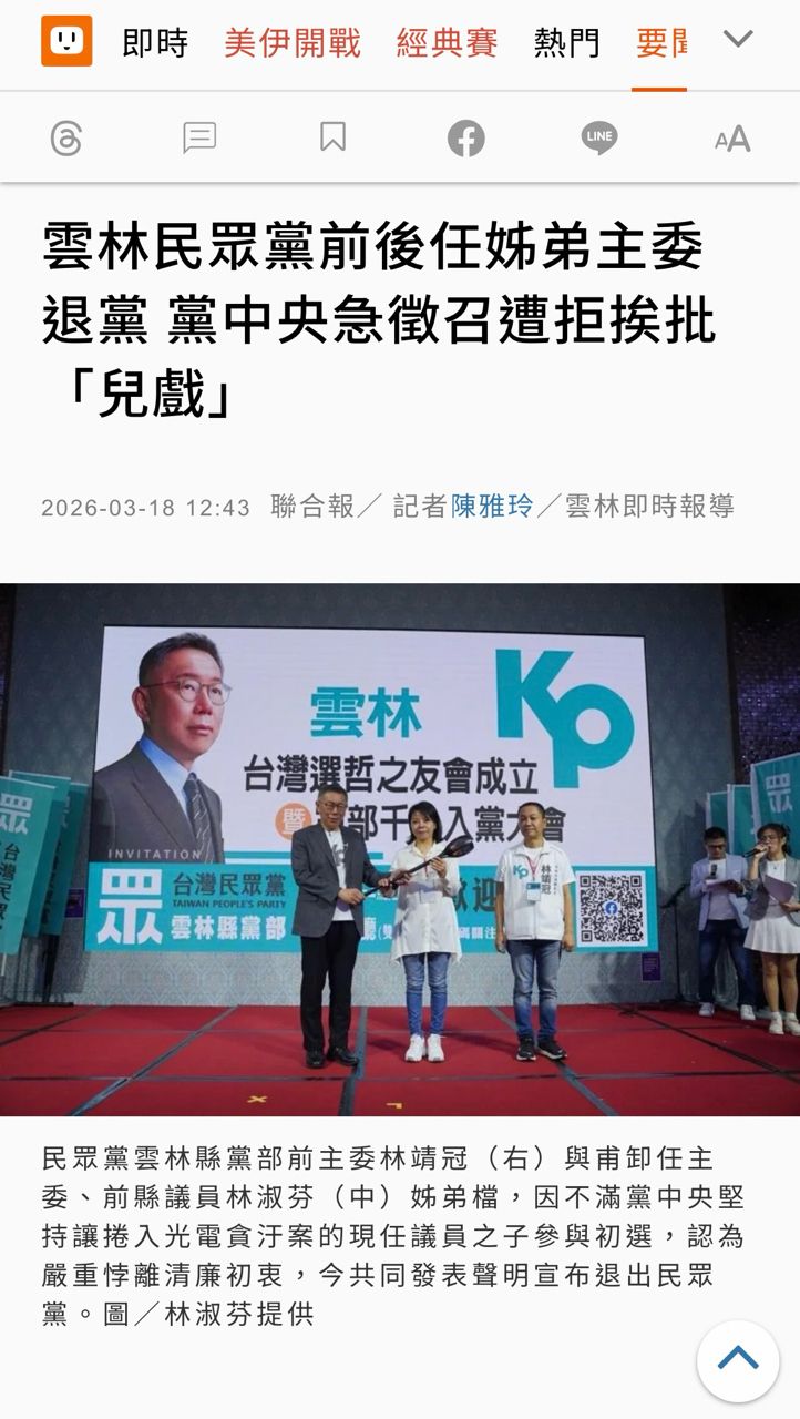 結果稍早聯合報的新聞提到民眾党初選,因為不滿對手是光電弊案貪污犯的兒子,所以一
