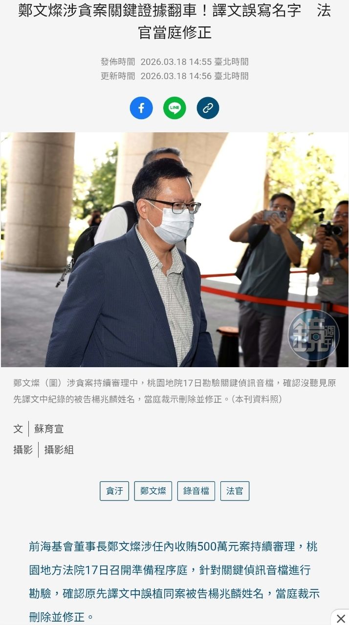 前桃園市長鄭文燦涉華亞科技園區土地開發貪污案。鏡週刊今天報導,被列為起訴證據的會議錄音檔疑似被檢方偽造。桃檢聲明,過程符合程序無勘驗不實情形,是否適法將由法院判斷。 ...