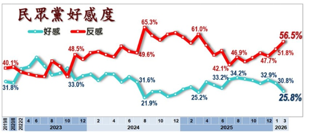 好感度25.8%(3%很滿意、22.8%有些好感),比1月減少5個百分點