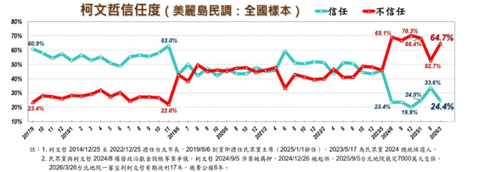 不信任64.7%(39.1%很不信任、25.6%有點不信任),較去年9月增加12%