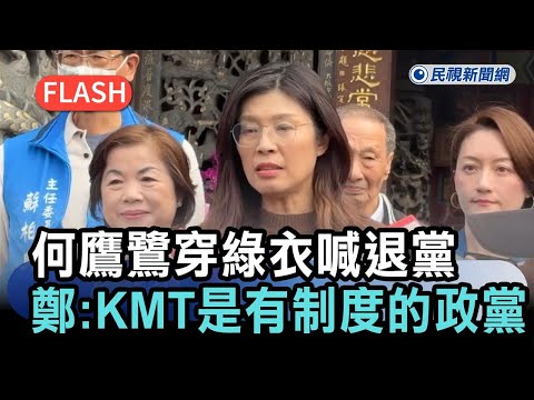 政治中心/綜合報導國民黨中常委何鷹鷺日前因為拍抖音,喊台灣回到祖國懷抱,遭黨紀處分,讓她不服!週三中常會上一身綠衣現身,還當場跟黨主席鄭麗文喊我變綠的,現場氣氛一度尷尬,出了中常會她更嗆不玩了要退黨,更痛批國民黨又要與美國、日本好,又要去找中國談,這是在玩火! ...