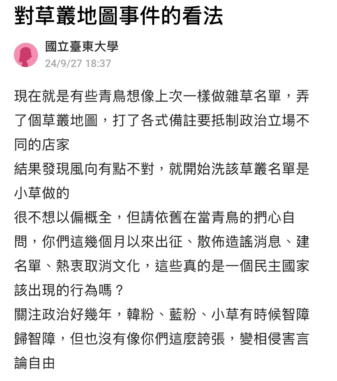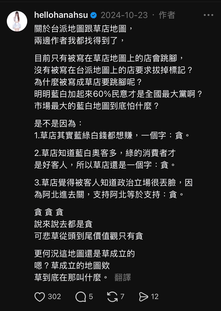 還有之前小草友善店家榜單出現時,小草也是哭夭說青鳥搞政治鬥爭、惡意抵制