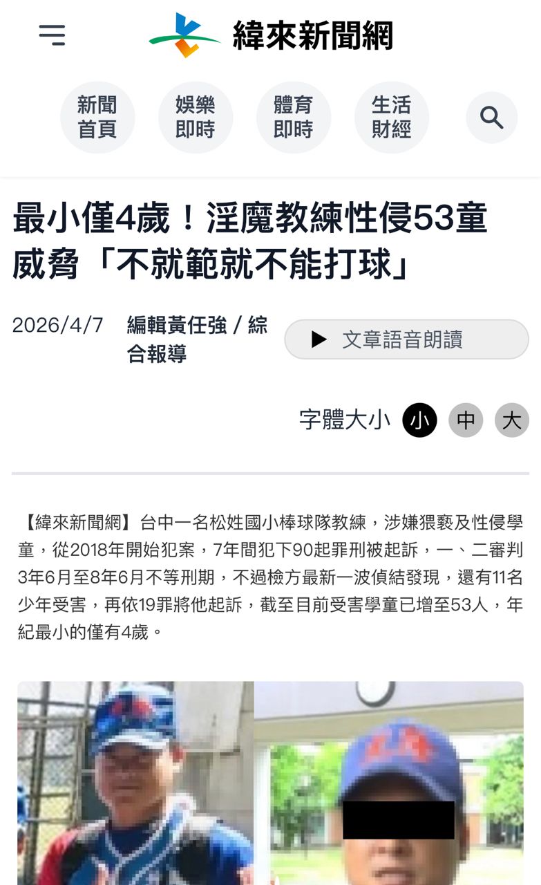 作者 charles0939 (charles0939)標題 [新聞] 台中教練性侵案 教育局「人數掌握不清」時間 Sat Apr 11 11:08:21 2026